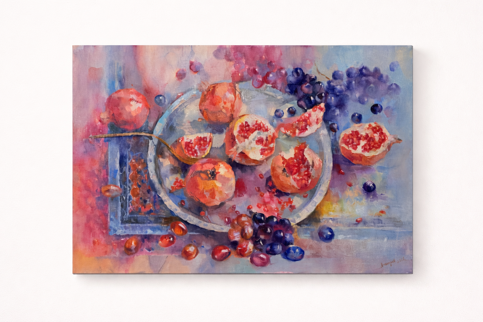 На изображении представлен натюрморт, выполненный в живописной манере. Картина изображает фрукты, среди которых выделяются гранат и виноград, расположенные на столе. Гранат разрезан пополам, демонстрируя ярко-красные зерна внутри, что добавляет композиции живости и контраста.