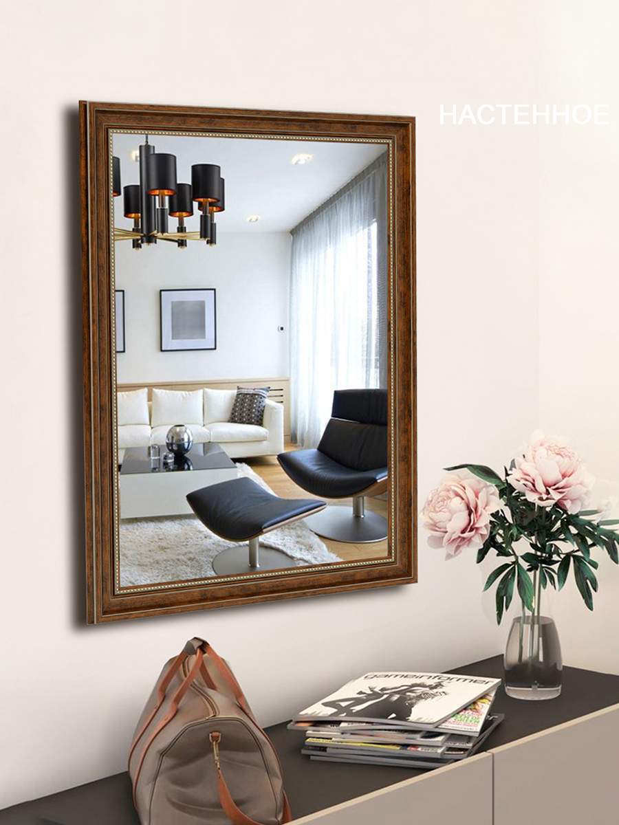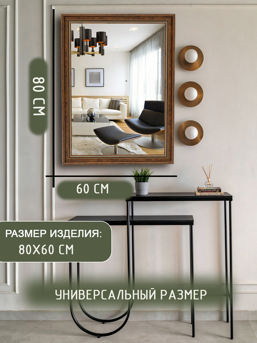 Зеркало в раме, настоящее зеркало, не искажает, не боится влаги, 60х80 см по внешнему размеру